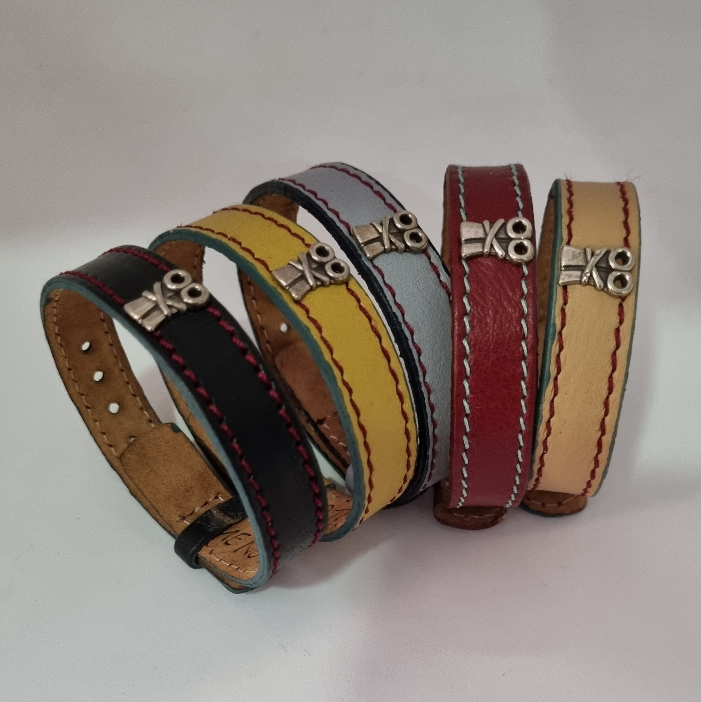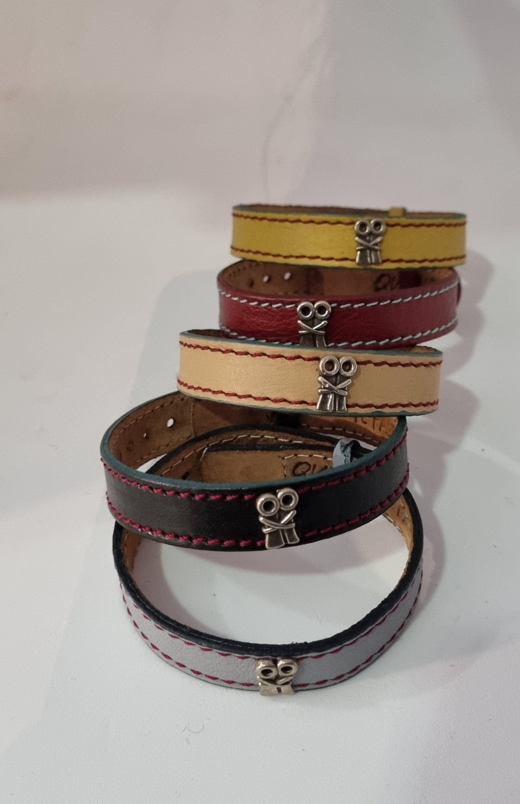 Pulsera de cuero unisex de distintos colores con remache de zamak bañado en plata del abrazo de Cariño